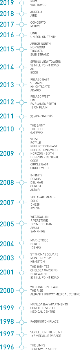 Finbar commenced its journey as a property developer in 1995 and 24 years later Finbar continues to shape Perth’s city skyline, and lifestyles of thousands or Western Australians. The variety of acknowledgements and awards attributed to Finbar can be seen here.